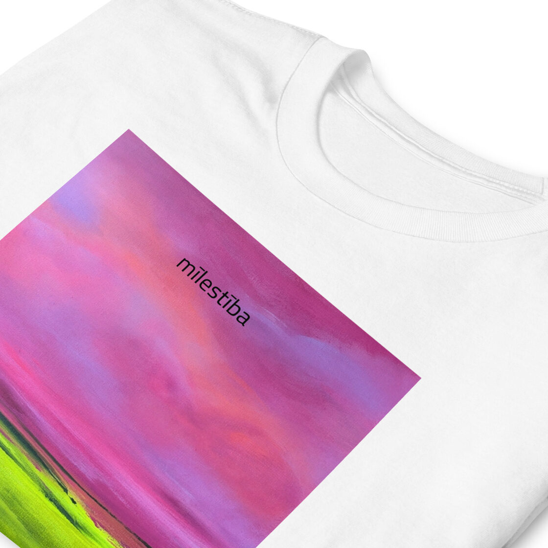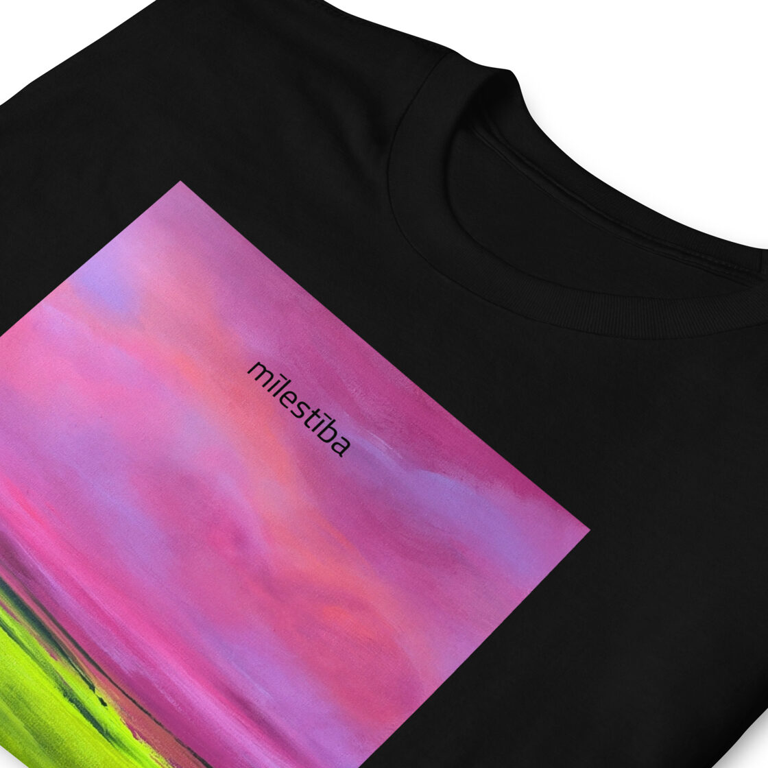 T-krekls ar manas gleznas apdruku, papildus pievienots neliels emocijas uzraksts "mīlestība". T-krekls MĪLESTĪBA pieejams 2 pamatkrāsās - balts un melns. Apdrukas izmērs: 25 x 25 cm . Drukai nav plēves sajūtas, tiešā druka uz tekstila.